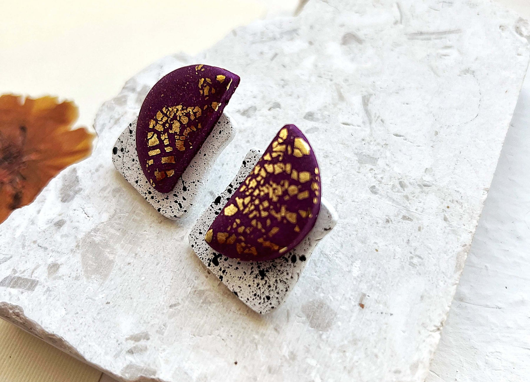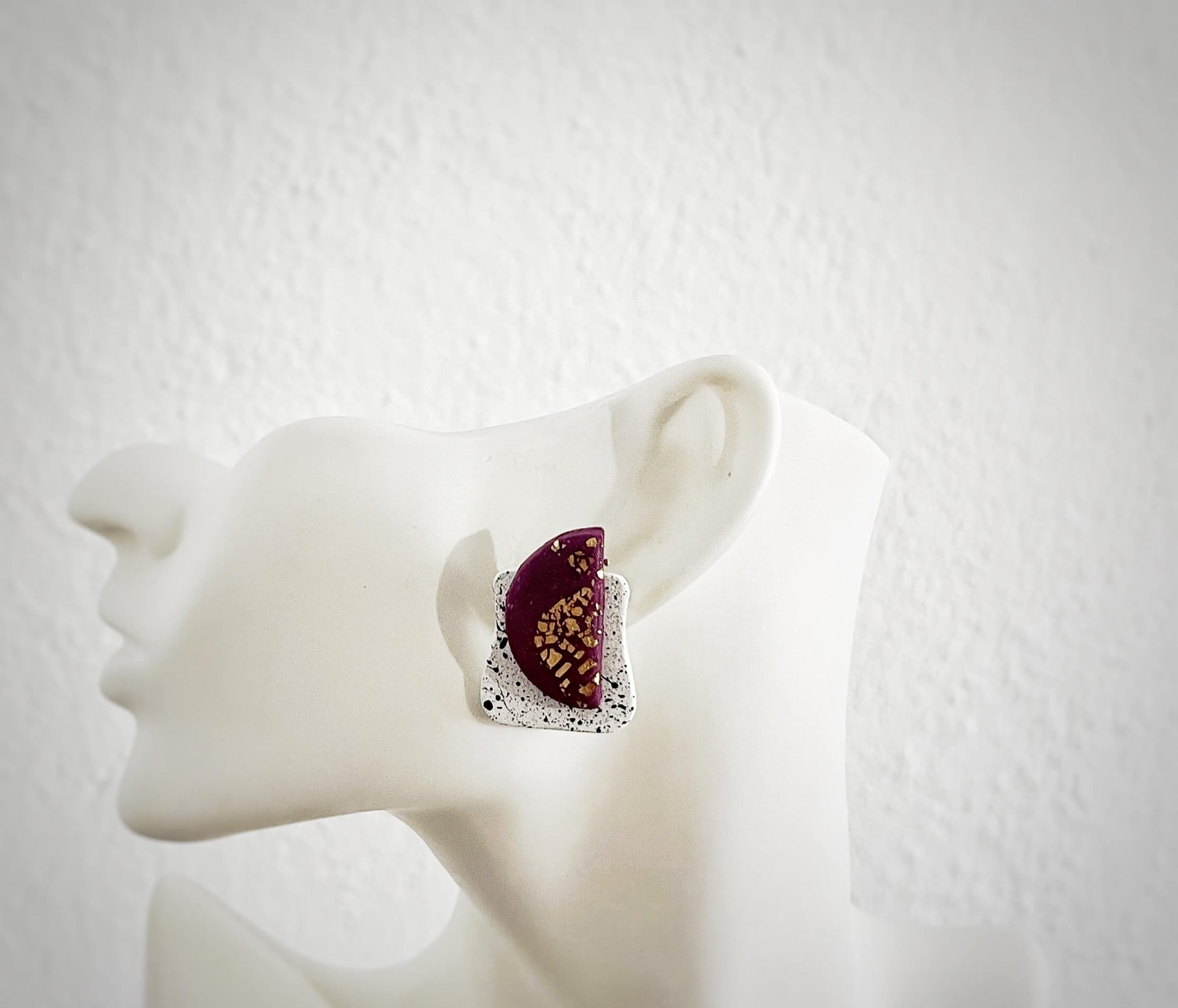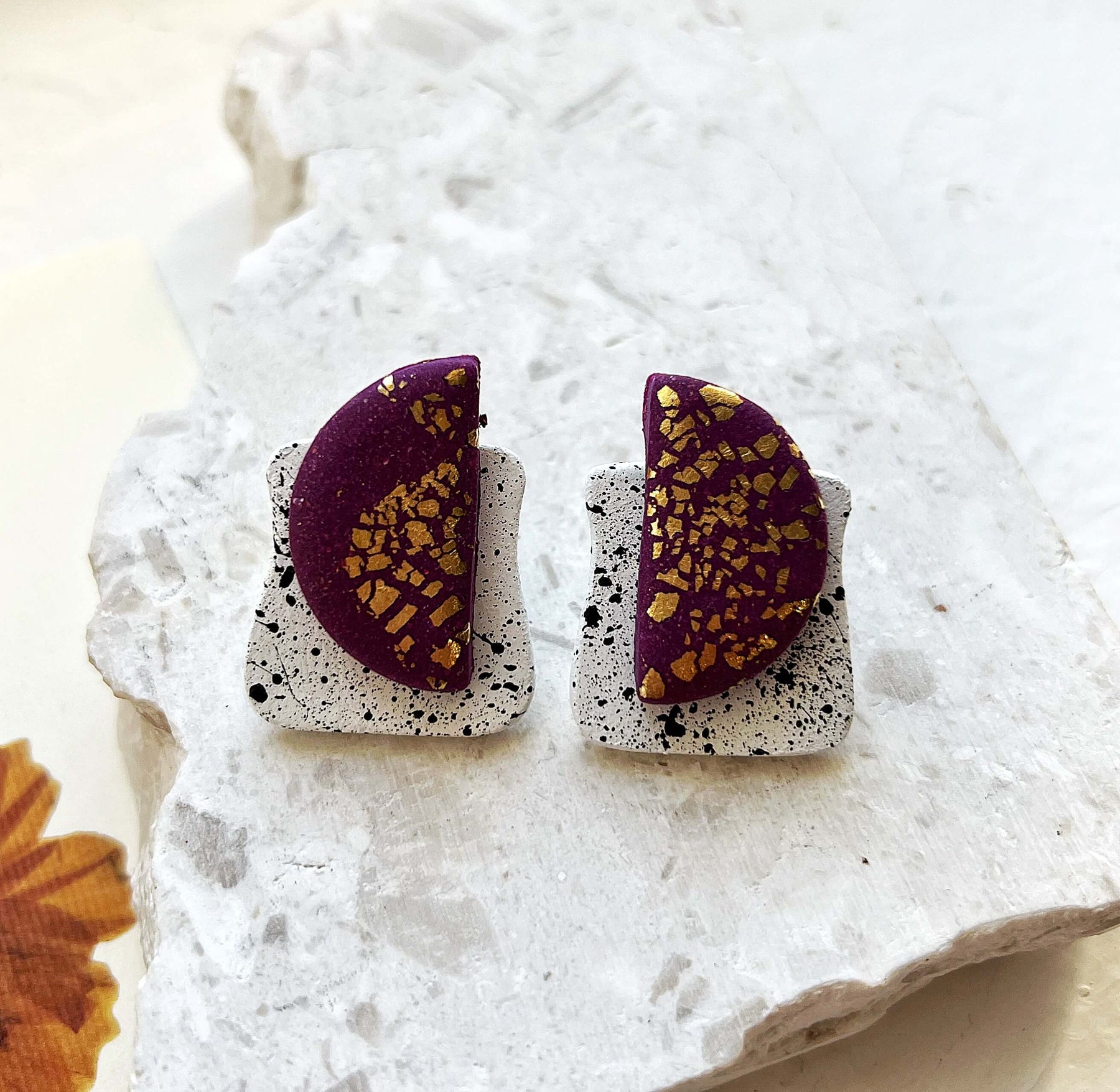 Μικρά ιδιαίτερα χειροποίητα σκουλαρίκια Etta από δύο είδη πηλού, καρφωτά, με σχέδιο σε λευκό με μαύρες πιτσιλιές και βαθύ μωβ. Minimal αλλά με προσωπικότητα, αυτά τα πιτσιλωτά σκουλαρίκια δίνουν μια μοντέρνα αίσθηση.