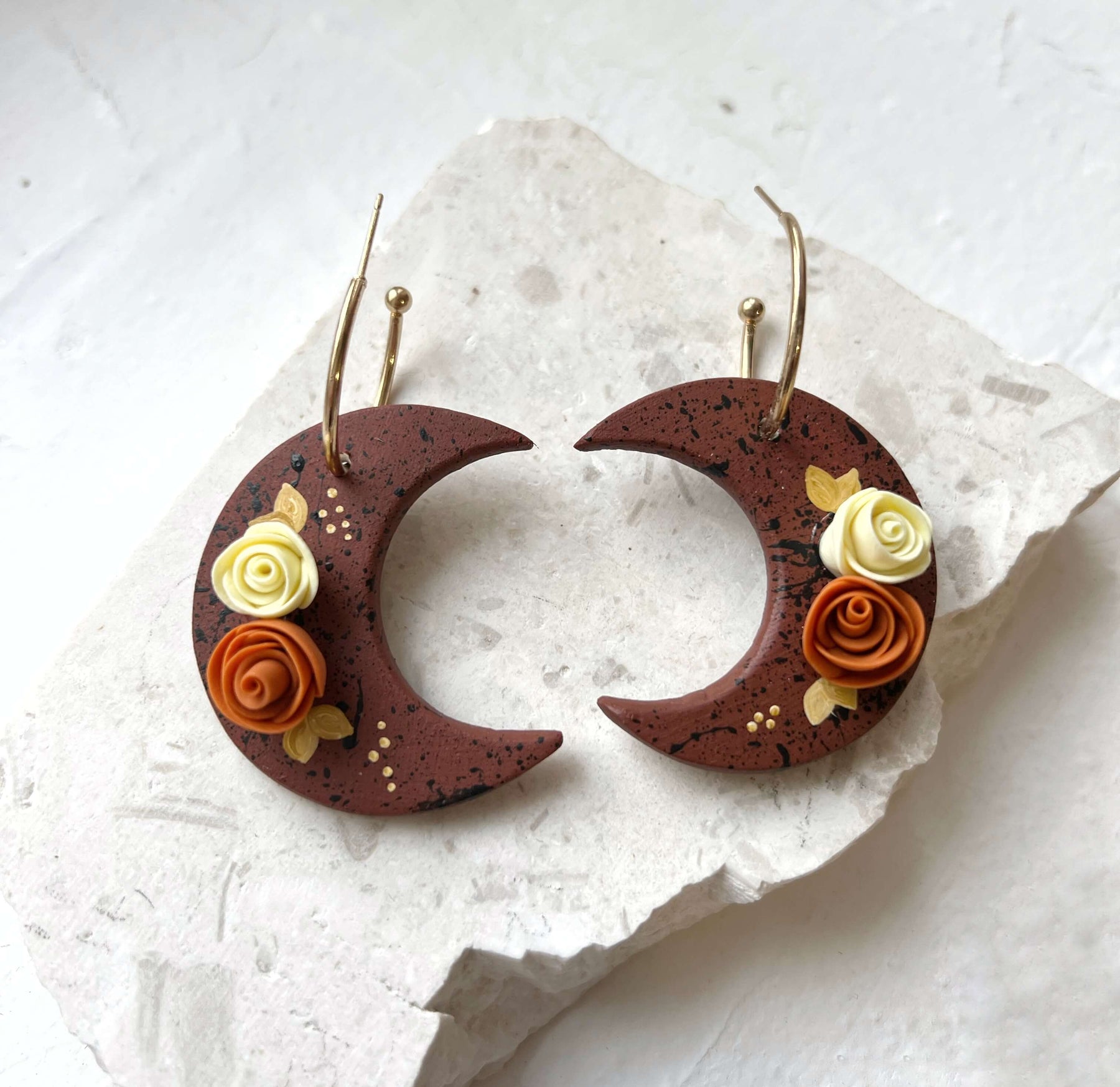 Χειροποίητα σκουλαρίκια Vince από πηλό, σε σχήμα μισοφέγγαρου, σε γήινη καφέ απόχρωση, διακοσμημένα με μικρά τριαντάφυλλα σε λευκό και απαλό πορτοκαλί. Ένα σχέδιο εμπνευσμένο από τη γη και το φεγγάρι, ιδανικά για γυναίκες που αγαπούν τα χειροποίητα, φυσικά κοσμήματα με διαχρονική γοητεία.