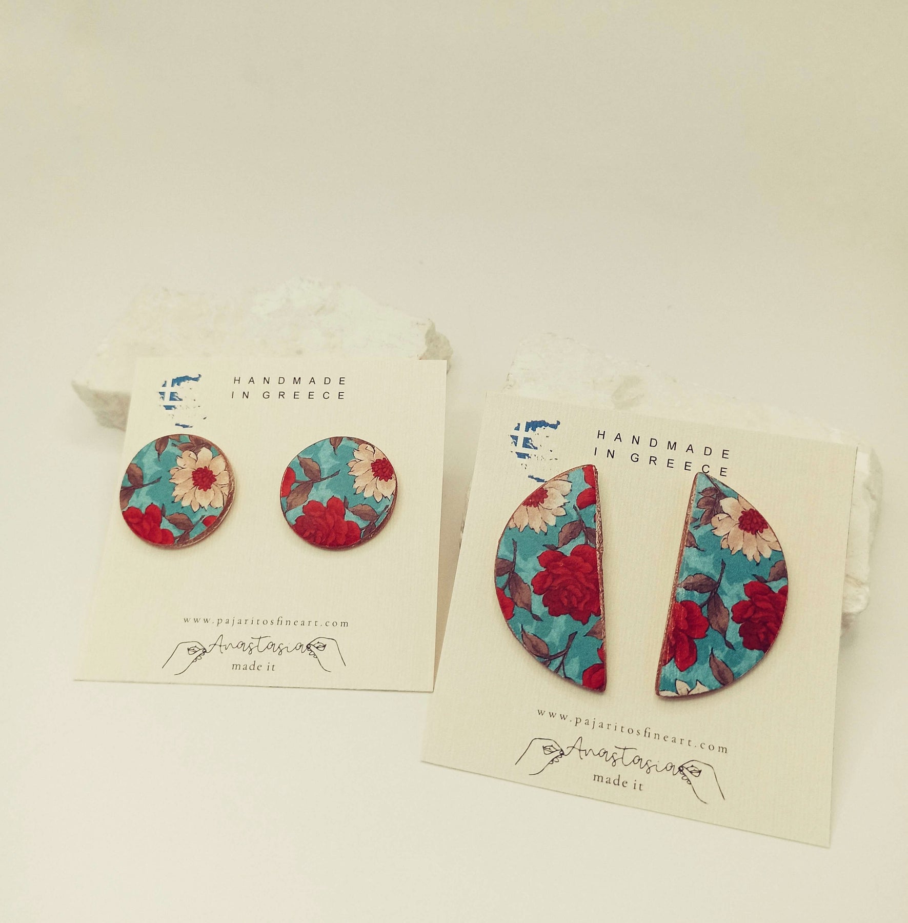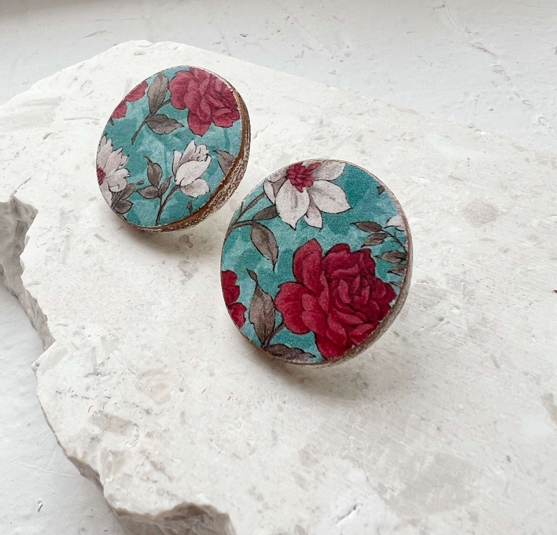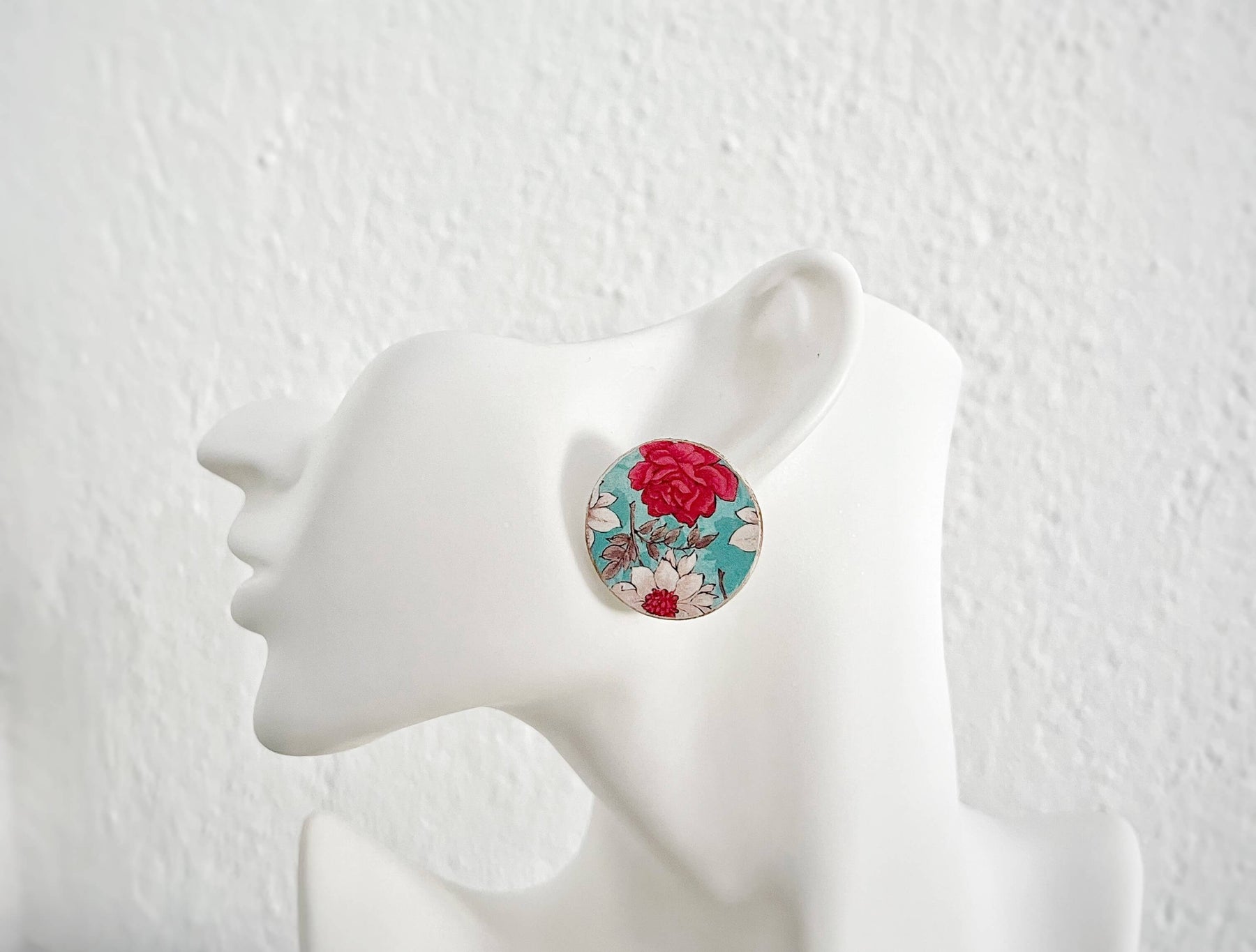 Χειροποίητα σκουλαρίκια, καρφωτά Farboise από πηλό, διακοσμημένα με ιδιαίτερο floral μοτίβο σε αποχρώσεις του μπλε και του κόκκινου. Εμπνευσμένα από ρετρό πορσελάνες και κλασικά μοτίβα, προσφέρουν έναν διακριτικό, vintage χαρακτήρα που ταιριάζει σε κάθε περίσταση.
