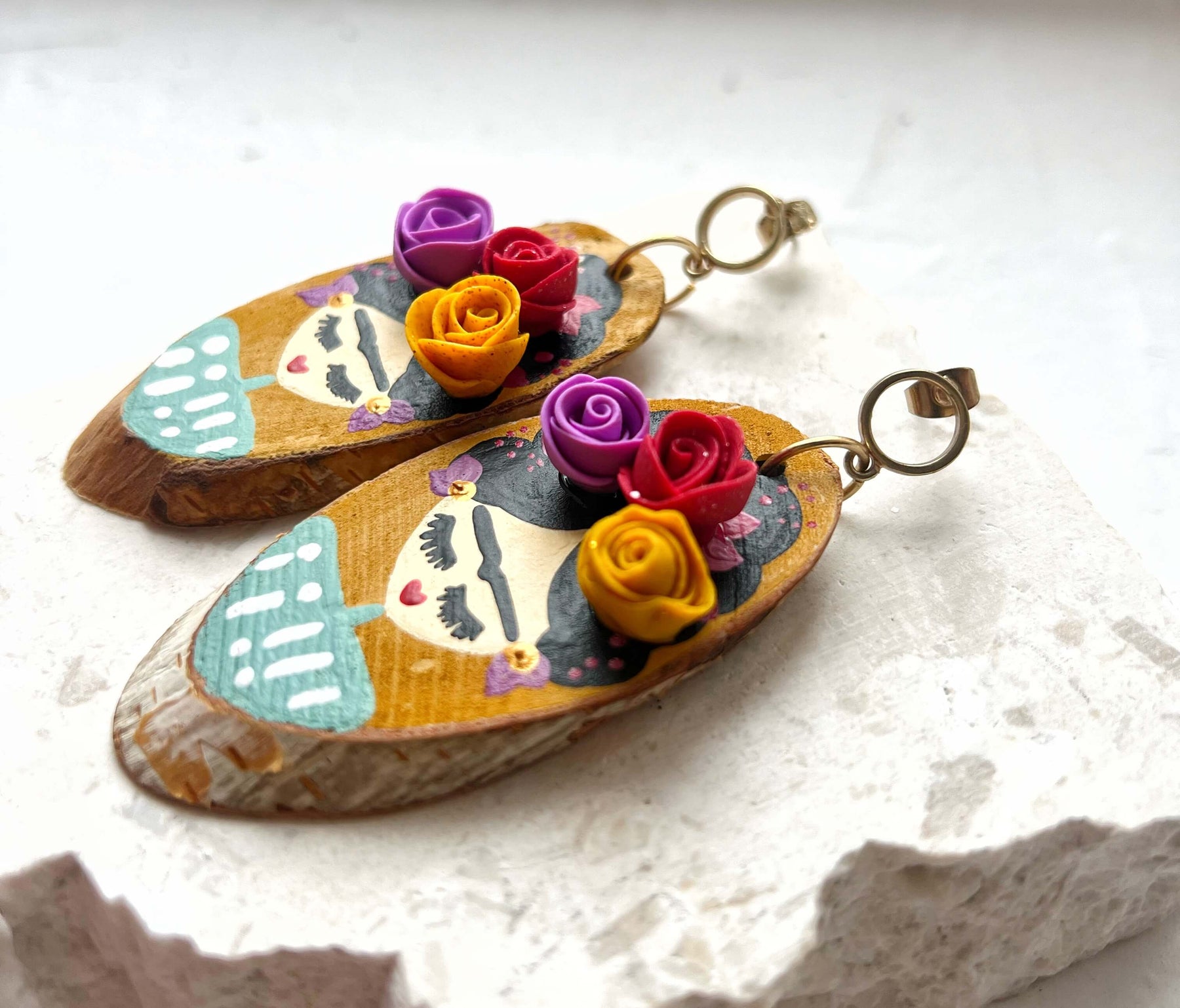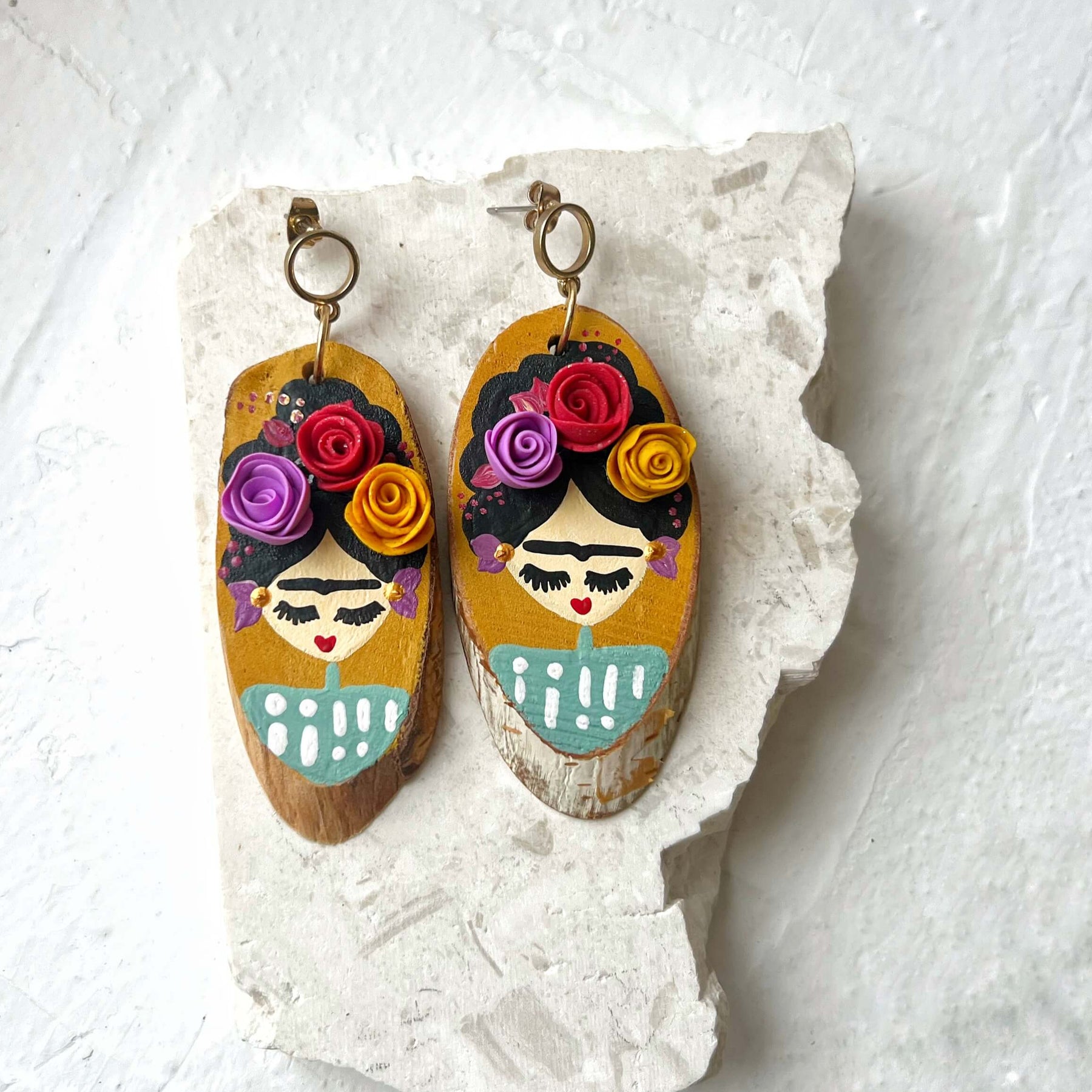 Χειροποίητα σκουλαρίκια Frida Kahlo Colorida εμπνευσμένα από τη μοναδική φιγούρα της Φρίντα Κάλο, με ξύλινη βάση σε απαλή ώχρα απόχρωση και διακοσμημένα με μικροσκοπικά, πολύχρωμα τριαντάφυλλα από πολυμερικό πηλό. Ένα παιχνιδιάρικο αλλά και συμβολικό σχέδιο που αποτυπώνει την αγάπη της Φρίντα για το χρώμα, τη φύση και τη λαϊκή τέχνη του Μεξικού. Ιδανικά για όσες θέλουν να φορούν λίγη τέχνη στα αυτιά τους!