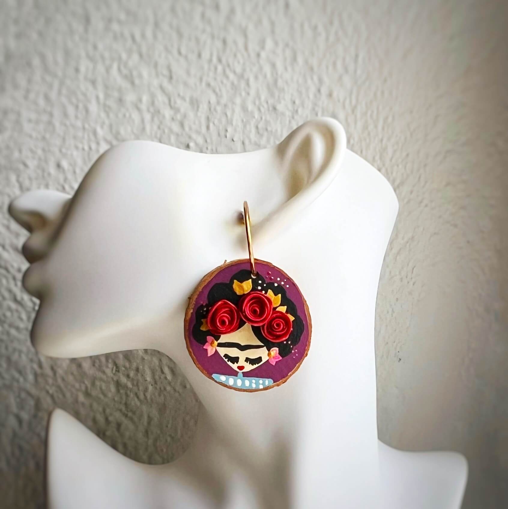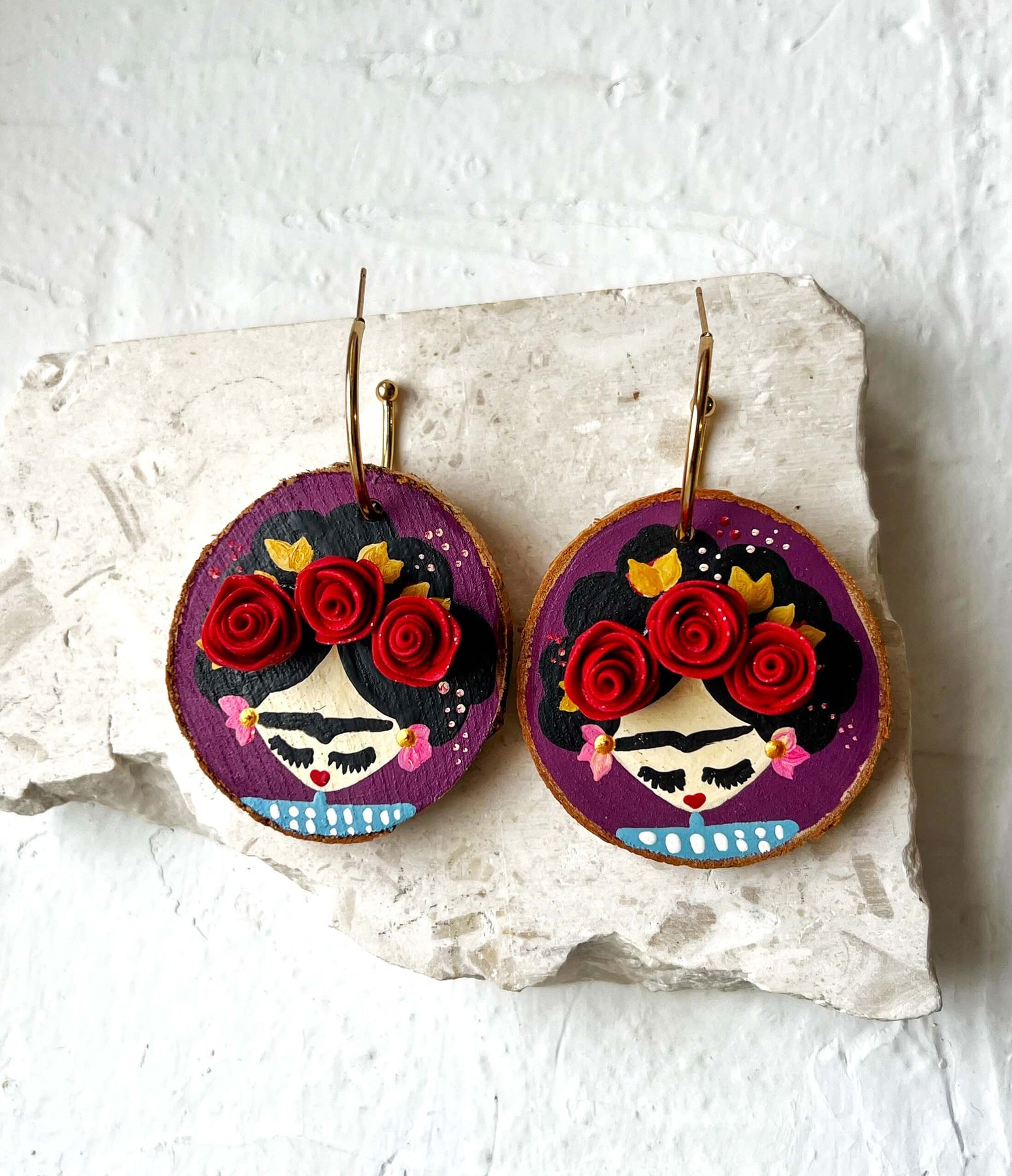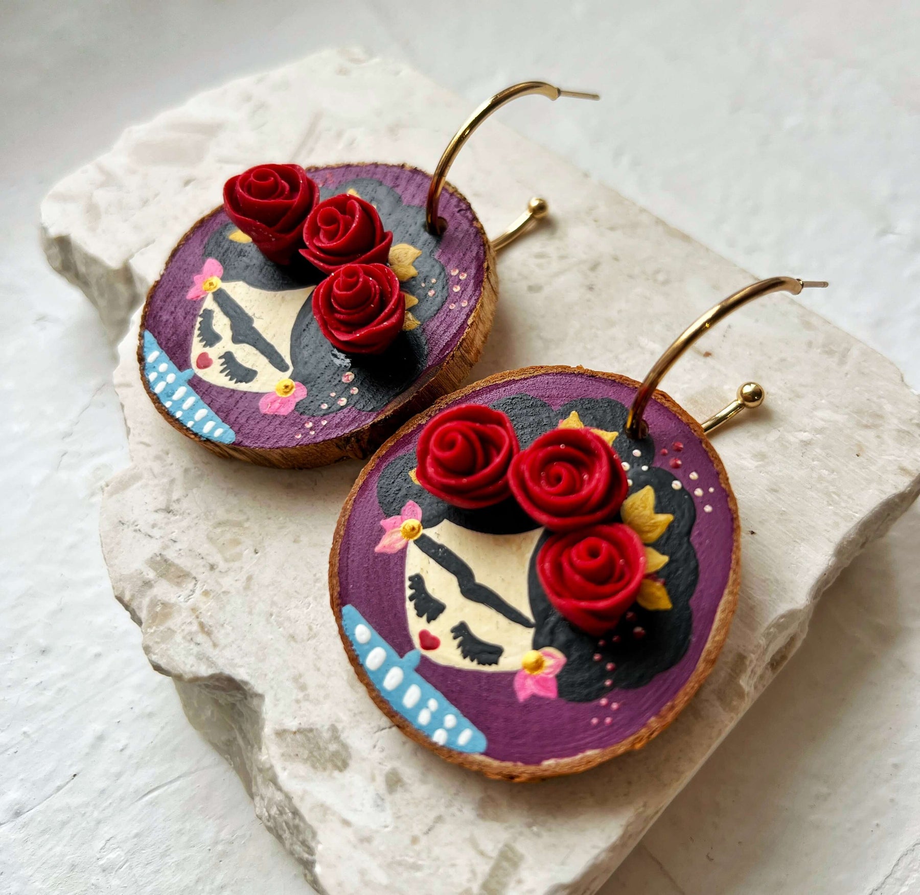 Χειροποίητα σκουλαρίκια Frida Kahlo Roja με τη χαρακτηριστική μορφή της Φρίντα Κάλο, πάνω σε μωβ, ξύλινη βάση με έντονα κόκκινα τριαντάφυλλα φτιαγμένα στο χέρι από πολυμερικό πηλό. Ένας δυναμικός χρωματικός συνδυασμός που αποπνέει πάθος, ένταση και μυστήριο, όπως ακριβώς και η ίδια η Φρίντα.