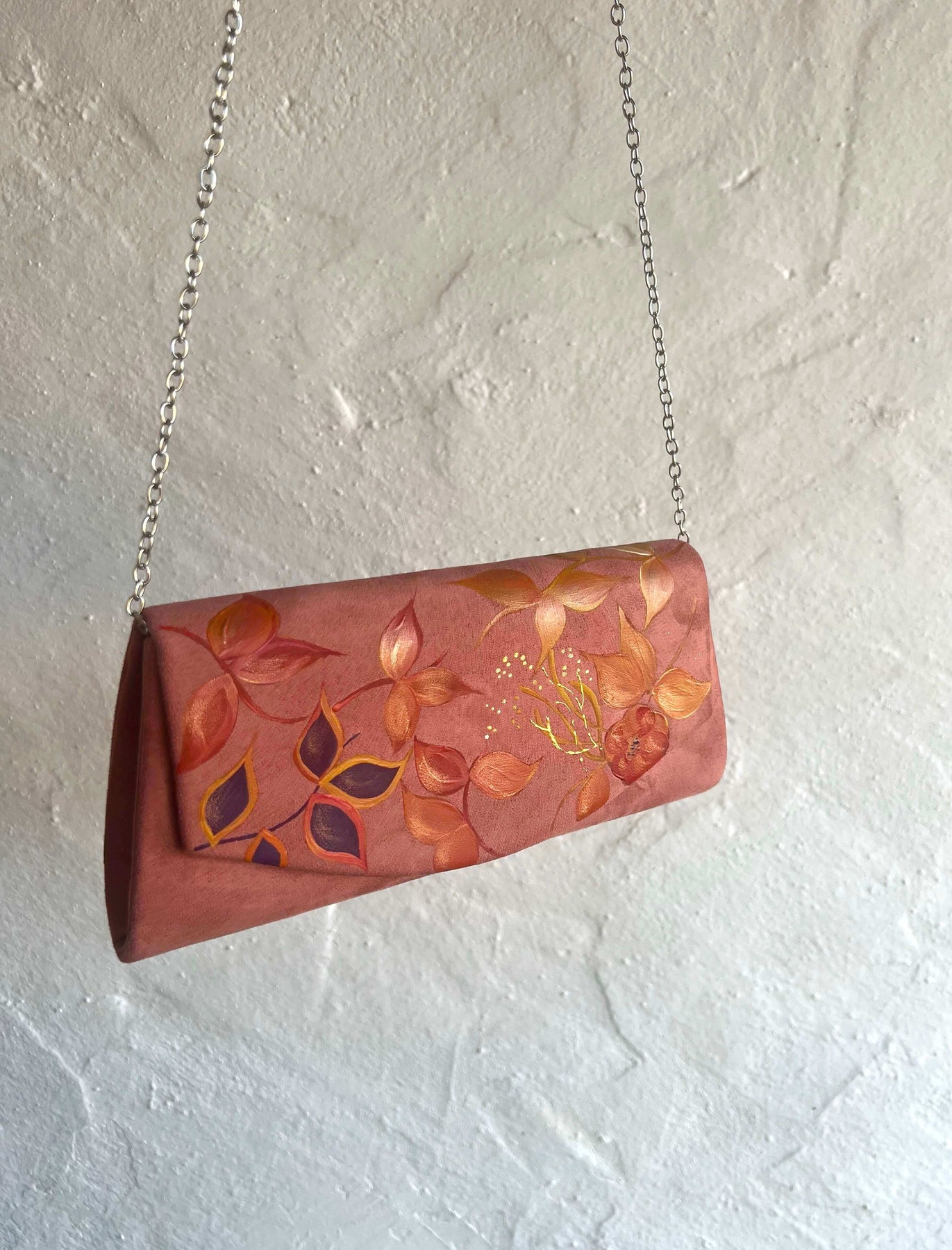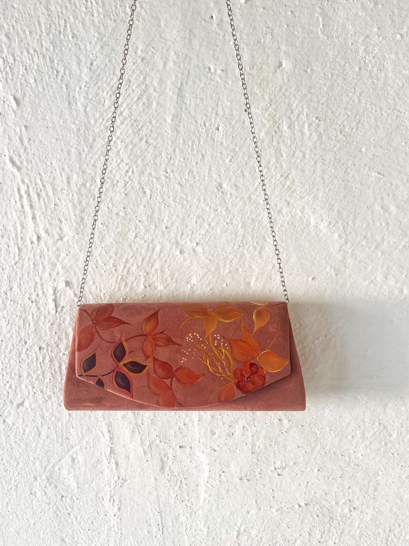 Μια ξεχωριστή τσάντα-φάκελος από suede σε χρώμα σάπιο μήλο, η Keisy είναι ζωγραφισμένη εξ ολοκλήρου στο χέρι με μοναδικά φθινοπωρινά μοτίβα. Οι ζεστές αποχρώσεις του χρυσού, της ώχρας και του δαμασκηνί δημιουργούν μια καλλιτεχνική σύνθεση που κάνει κάθε κομμάτι μοναδικό.