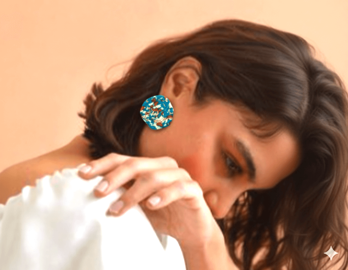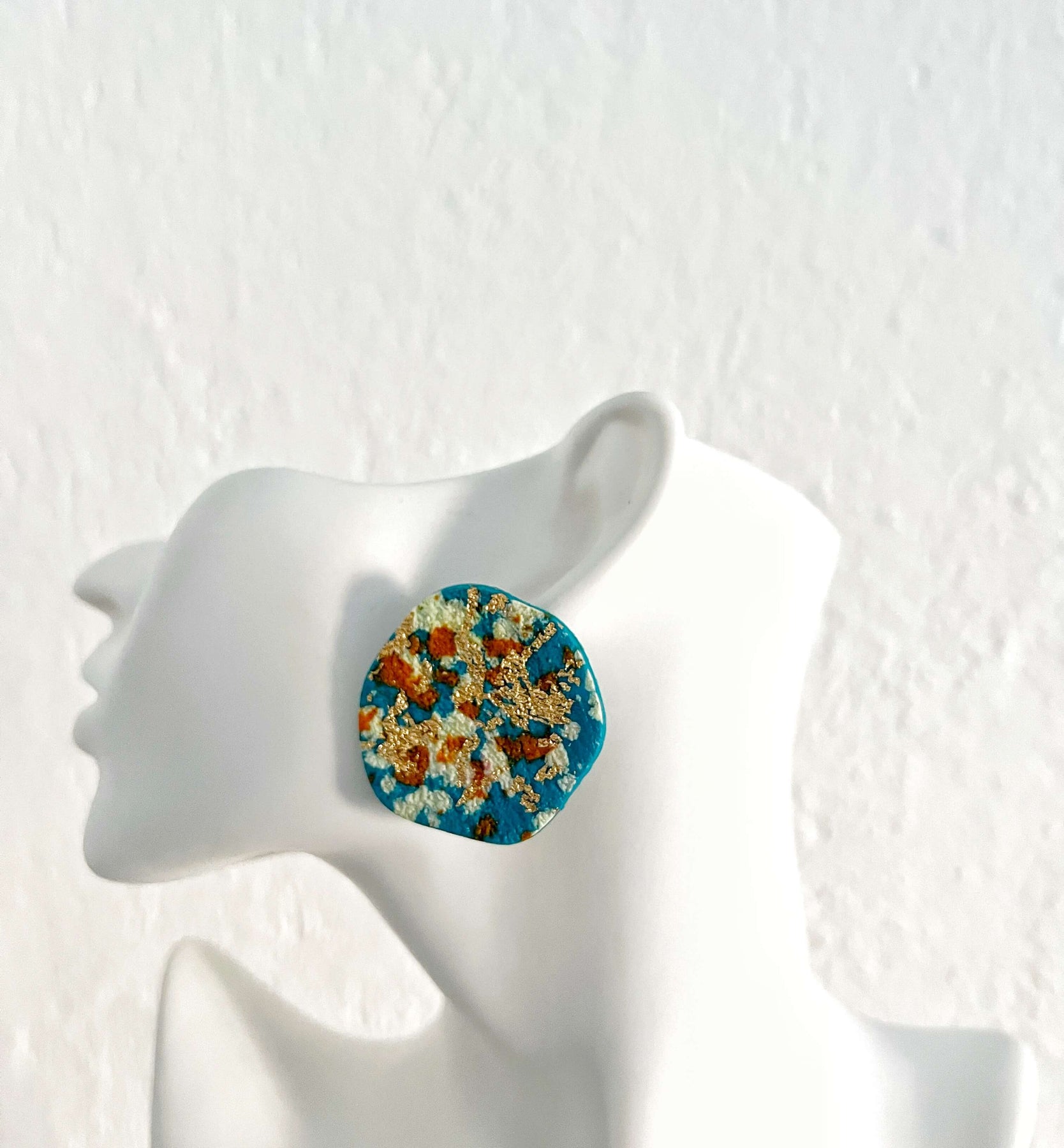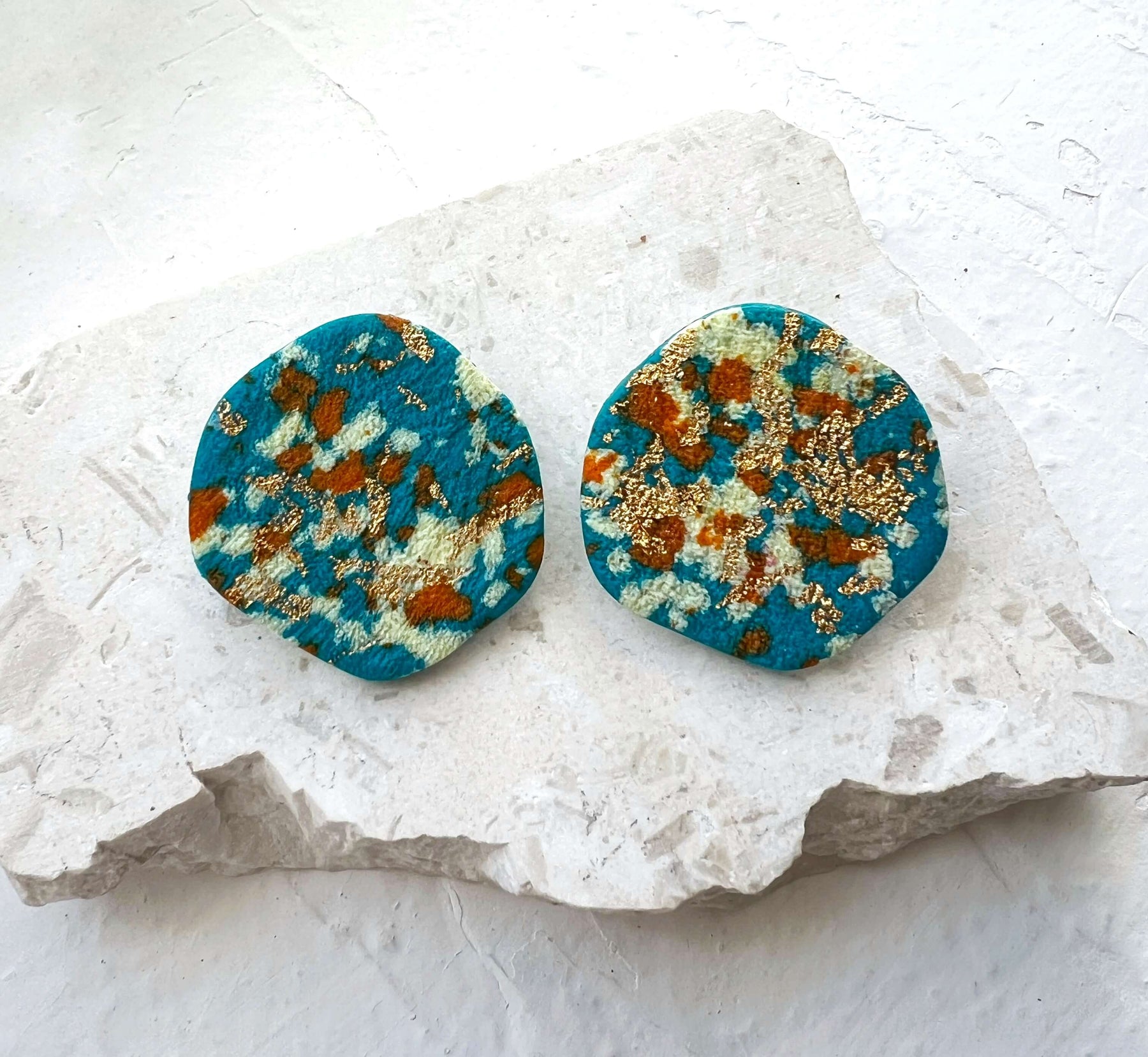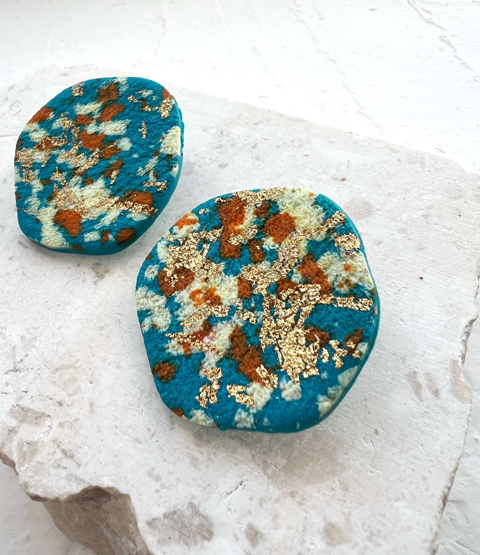 Μεγάλα χειροποίητα σκουλαρίκια Blue Reef από πολυμερικό πηλό, εμπνευσμένα από την υφή και τα χρώματα του βυθού. Ζωντανό μπλε, πορτοκαλί και φύλλα χρυσού δημιουργούν έναν μοναδικό καμβά χρωμάτων. Ιδανικά για γυναίκες που θέλουν να ξεχωρίζουν με ένα αυθεντικό, καλλιτεχνικό κόσμημα.