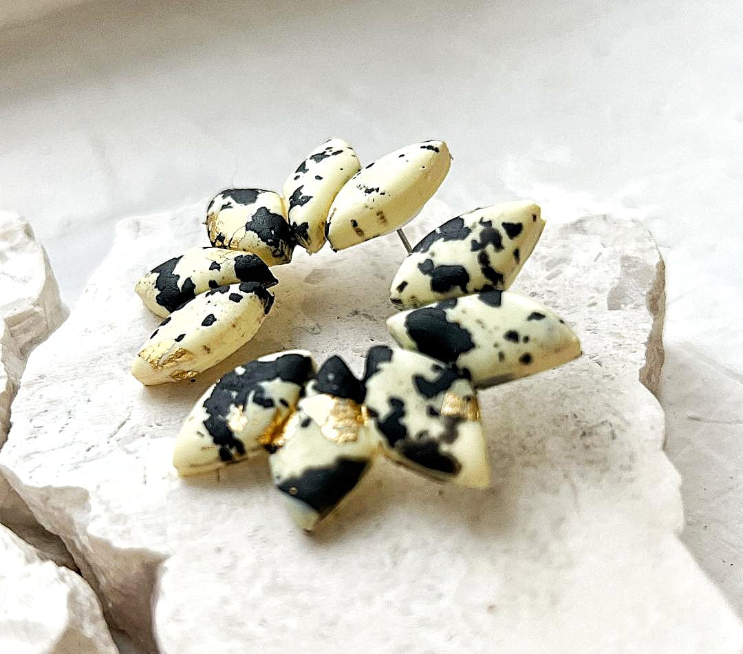 Τα Lysa Delia είναι εντυπωσιακά χειροποίητα σκουλαρίκια, φτιαγμένα από πολυμερικό πηλό σε μοναδικό cow animal print με διακριτικές λεπτομέρειες από φύλλα χρυσού. Το αφηρημένο, μοντέρνο σχέδιό τους και η ελαφριά τους κατασκευή τα καθιστούν ιδανικά για καθημερινή χρήση αλλά και ιδιαίτερες εμφανίσεις.