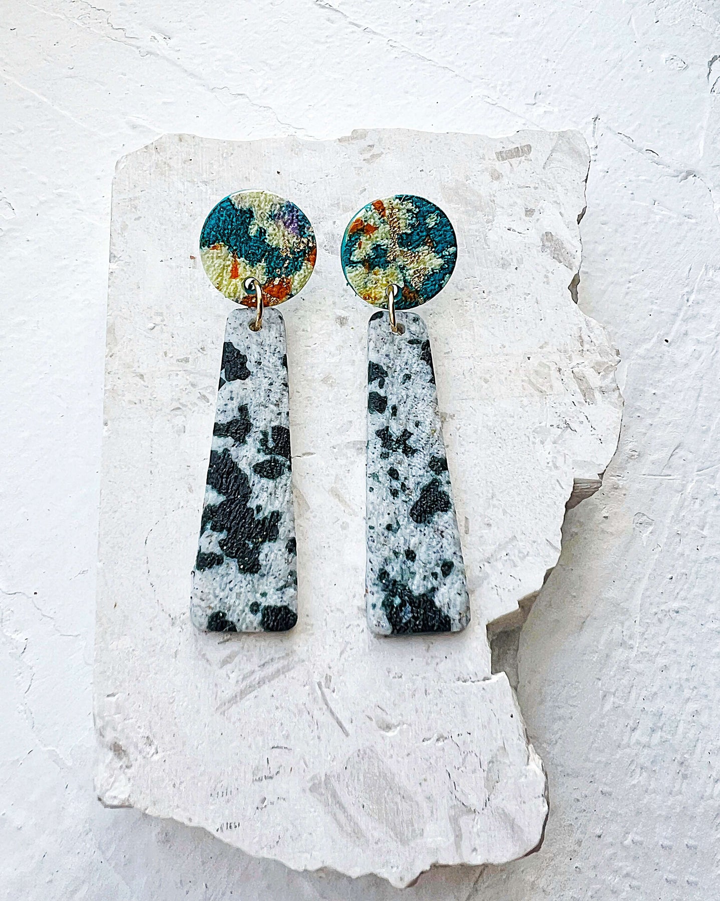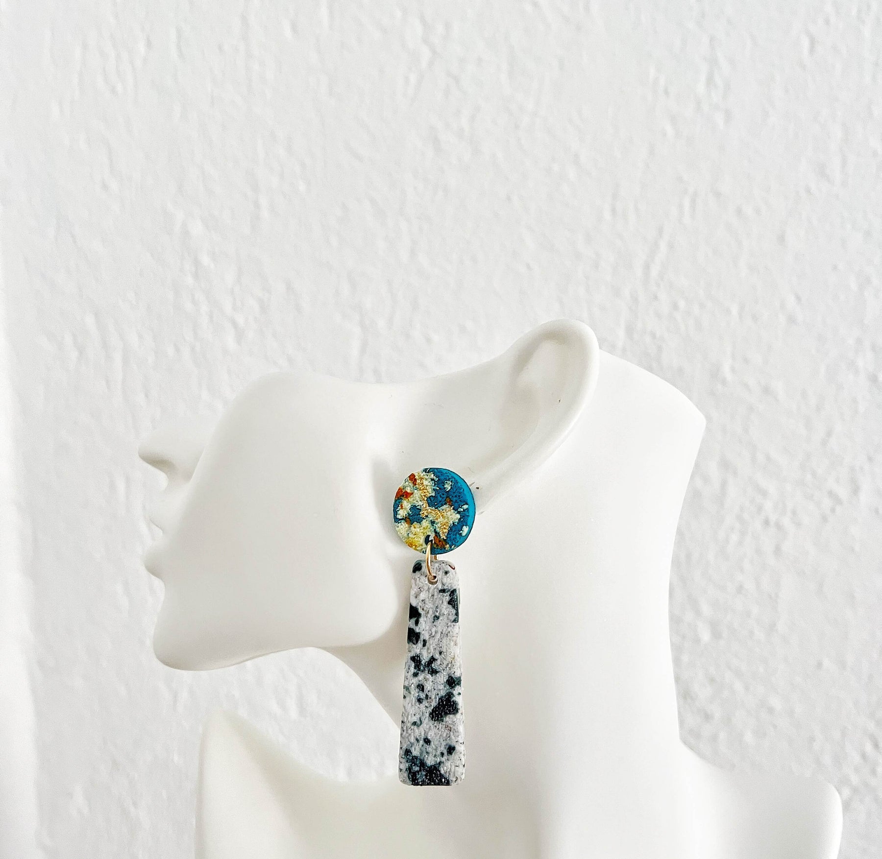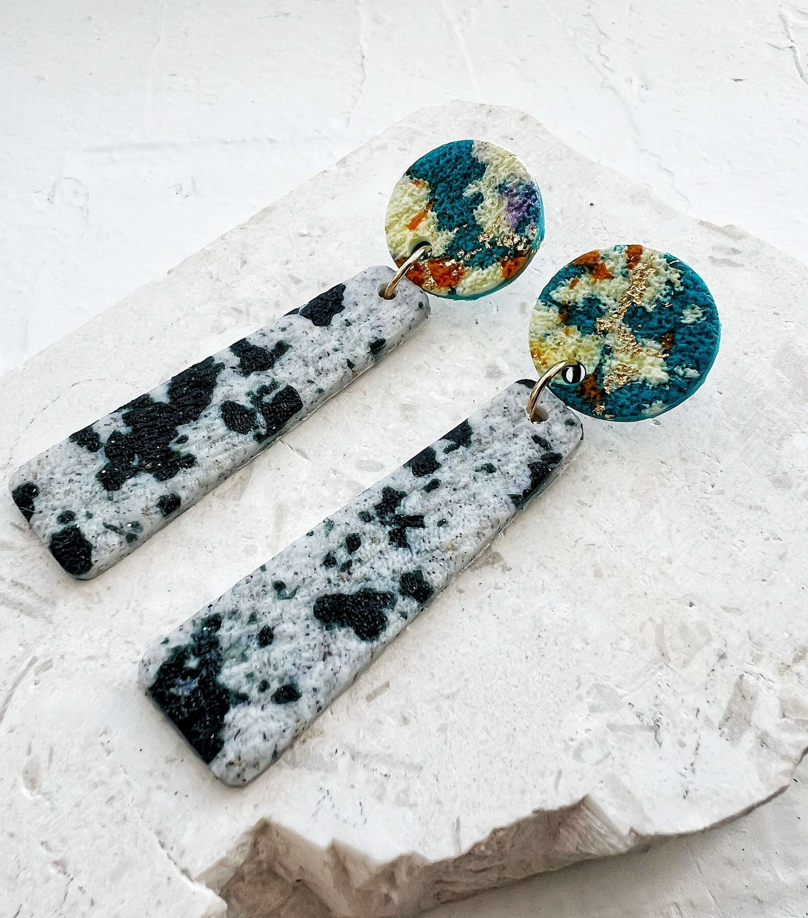 Εντυπωσιακά χειροποίητα μακριά σκουλαρίκια Ocean Mist από πολυμερικό πηλό με λεπτομέρειες από φύλλα χρυσού. Η στρογγυλή βάση σε έντονο μπλε με χρυσές πινελιές συνδυάζεται με κρεμαστά στοιχεία σε μαρμάρινη υφή. Ένα statement κόσμημα που αποπνέει κομψότητα και μοντέρνο χαρακτήρα.