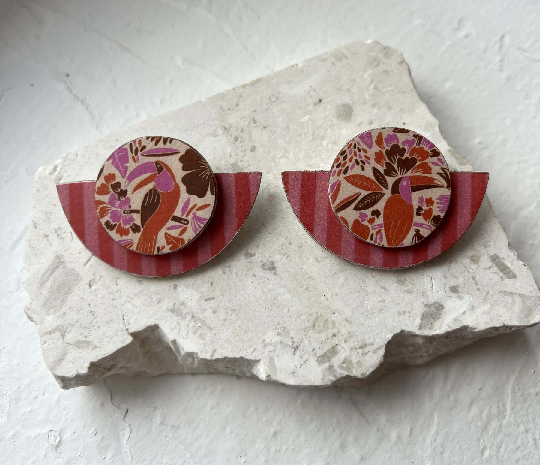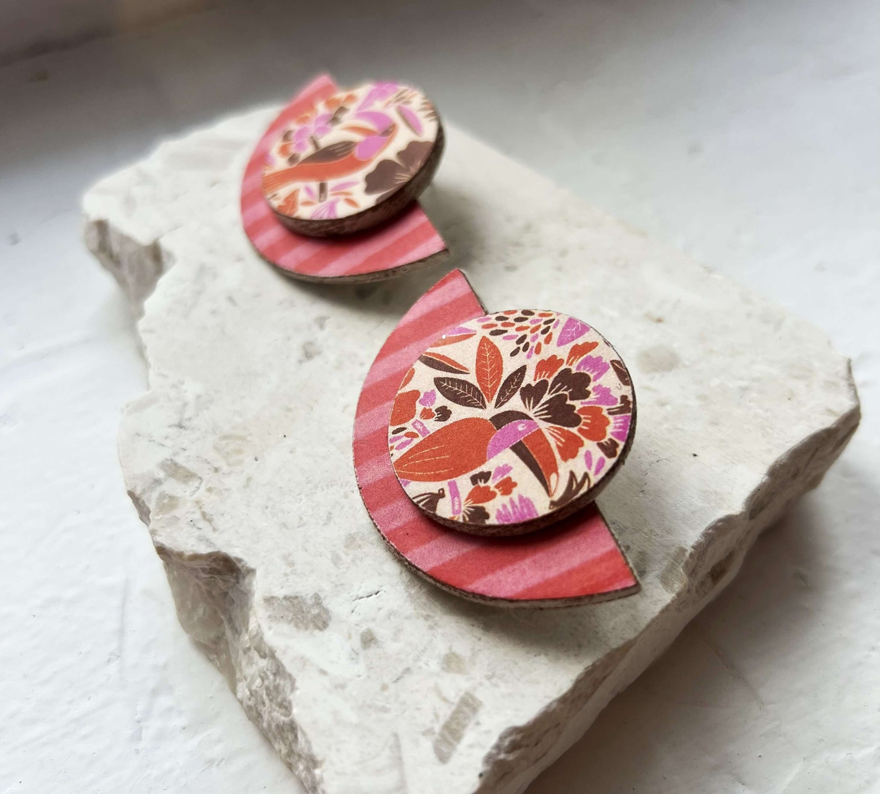 Tα σκουλαρίκια Saffron Garden είναι χειροποίητα από πηλό εμπνευσμένα από τις ζεστές αποχρώσεις του ηλιοβασιλέματος, με ριγέ ροζ και κόκκινες ρίγες και τις λουλουδάτες λεπτομέρειες από τα τροπικά πουλιά. Ιδανικά για γυναίκες που επιθυμούν μια διακριτική πινελιά εξωτικής κομψότητας!