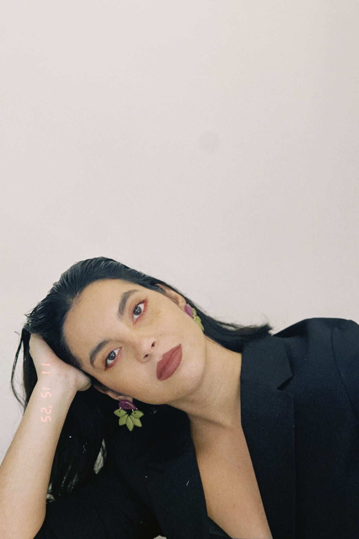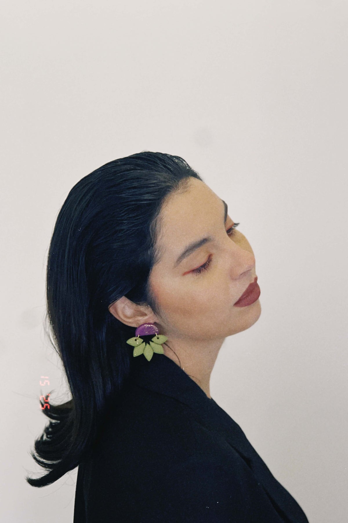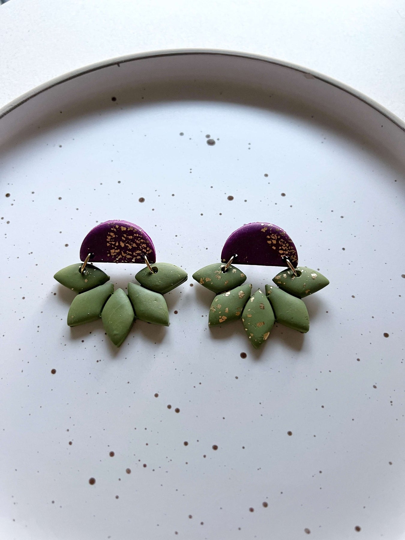 Τα χειροποίητα σκουλαρίκια Astra είναι μια τολμηρή μίξη βαθύ μωβ και πράσινου, με μικρές λεπτομέρειες φύλλων χρυσού.