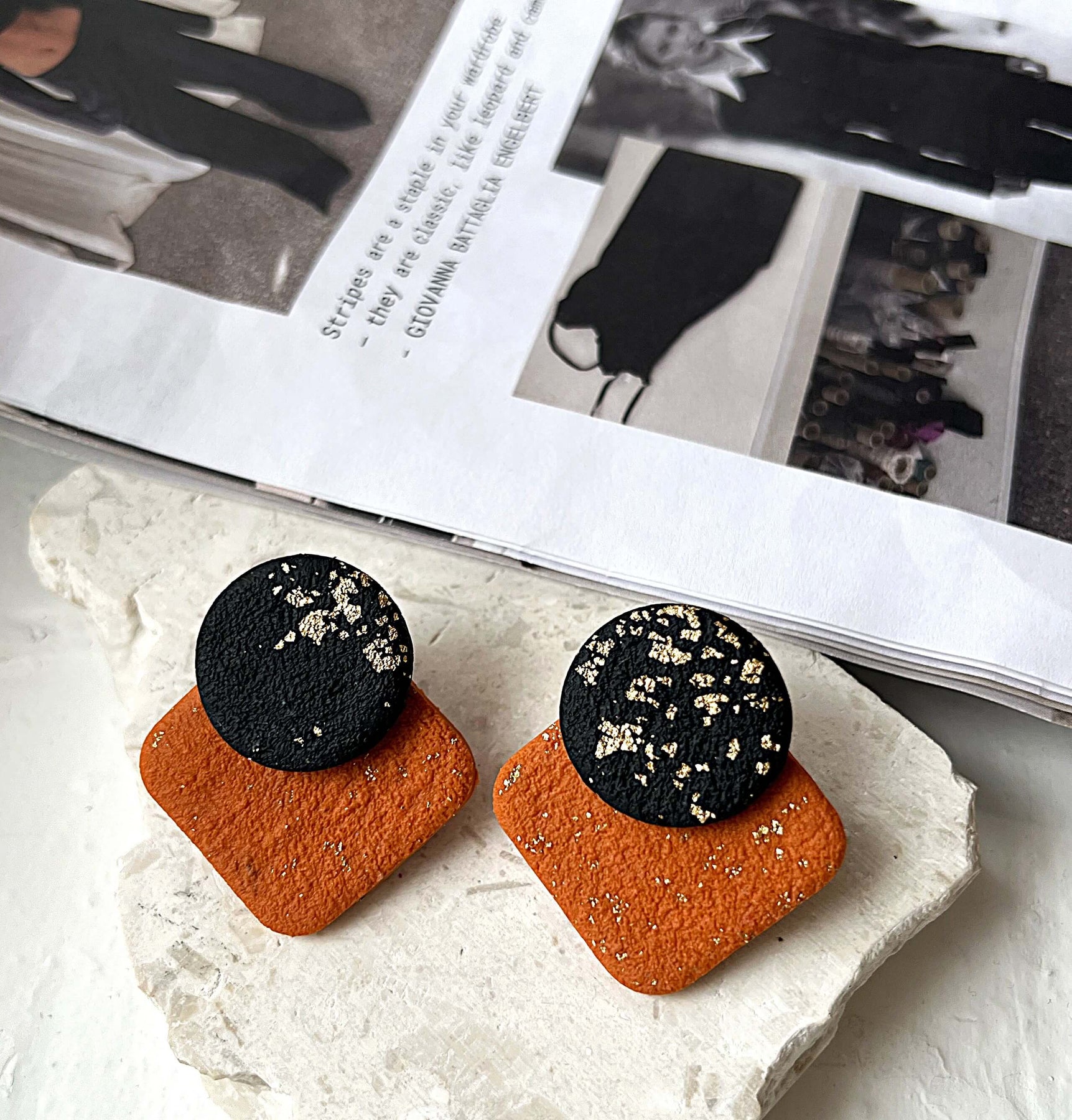 Σκουλαρίκια μοντέρνα χειροποίητα Indra από πολυμερικό πηλό και λεπτομέρειες απο φύλλα χρυσου. Έχουν ιδιαίτερο κεραμιδί και μαύρο χρώμα με γεωμετρικό σχήμα και ανάγλυφη υφή. Ιδανικά για ξεχωριστά γυναικεία δώρα ή για όσες αγαπούν τα πρωτότυπα σκουλαρίκια.