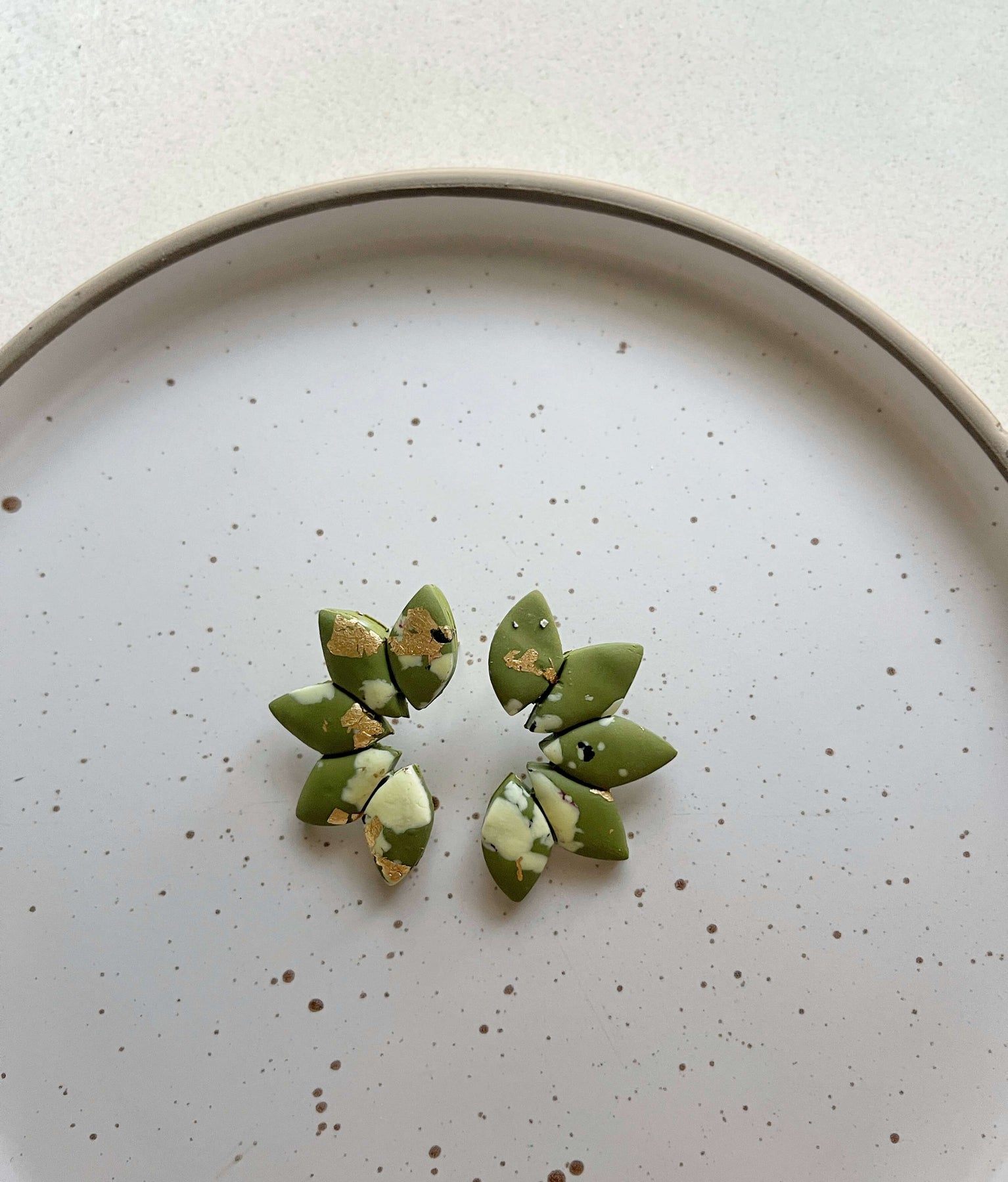 Τα Lenar είναι εντυπωσιακά χειροποίητα σκουλαρίκια, φτιαγμένα από πολυμερικό πηλό σε μοναδική πράσινη απόχρωση με διακριτικές λεπτομέρειες λευκού, μαύρου και φύλλων χρυσού. Το αφηρημένο, μοντέρνο σχέδιό τους και η ελαφριά τους κατασκευή τα καθιστούν ιδανικά για καθημερινή χρήση αλλά και ιδιαίτερες εμφανίσεις. Ιδανική πρόταση και για ένα πρωτότυπο γυναικεό δώρο.