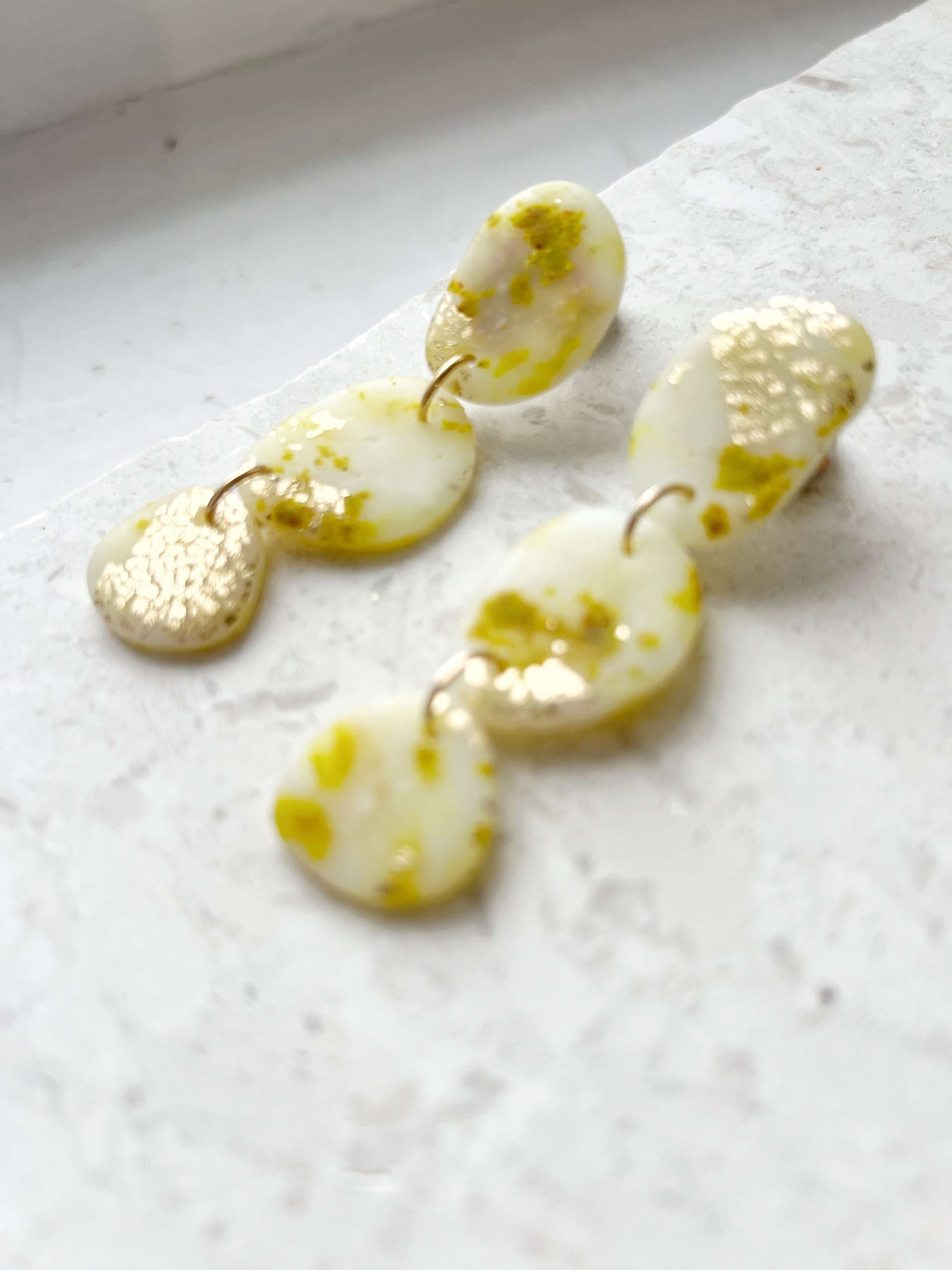 Κρεμαστά σκουλαρίκια χειροποίητα Melia από πολυμερικό πηλό, με γαλακτερή υφή και ιδιαίτερες νότες lime χρώμματος. Οι μικρές πινελιές από φύλλα χρυσού τους δίνουν ένα subtle glow, όσο χρειάζεται για να σταθούν όμορφα σε καθημερινά και πιο dressed-up looks. Ιδανικά και για ξεχωριστά γυναικεία δώρα ή για όσες αγαπούν τα μακρυά σκουλαρίκια.